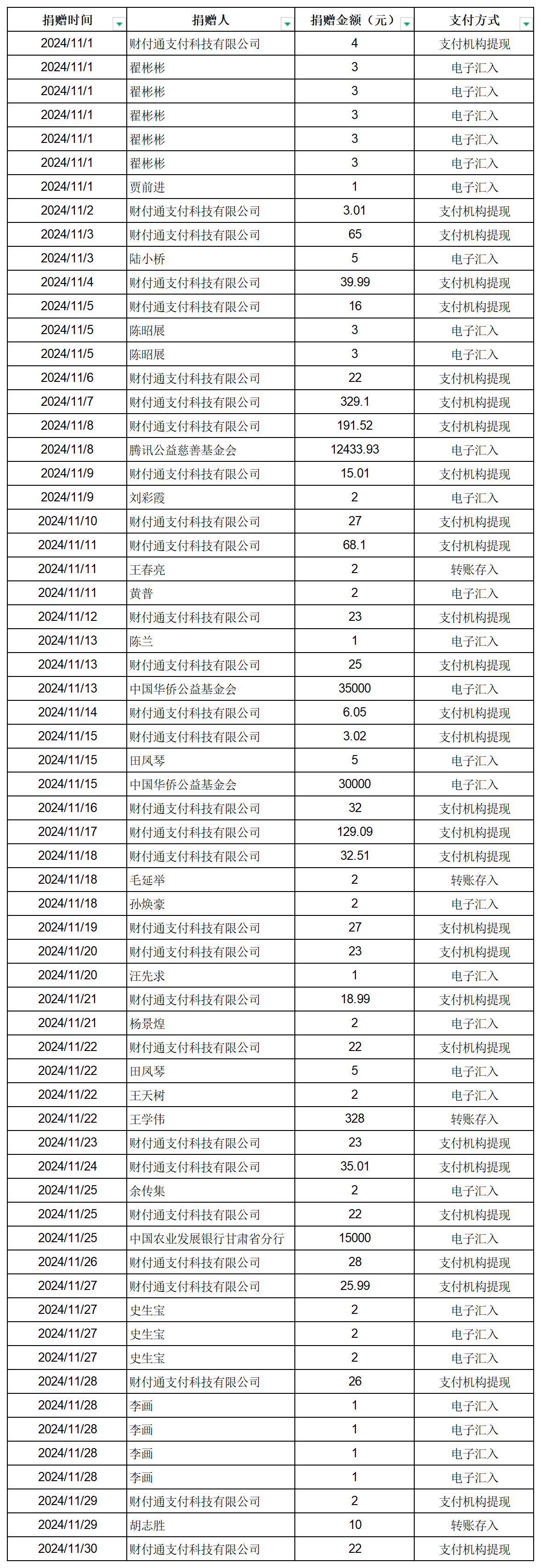 2024年張掖市慈善協(xié)會(huì)積極搭建愛(ài)心平臺(tái),得到廣大愛(ài)心人士和愛(ài)心單位積極響應(yīng),踴躍捐款捐物,現(xiàn)將(2024年11月1日--11月30日)銀行轉(zhuǎn)賬收入公示如下:
